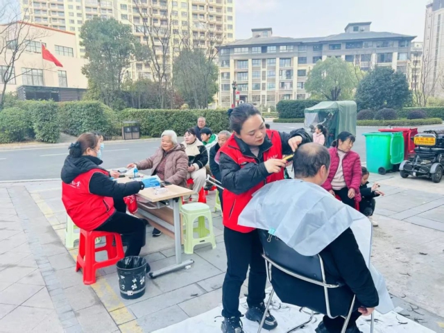 地產(chǎn)集團物業(yè)公司團支部組織青年志愿者在小區(qū)免費為業(yè)主測量血壓、血糖,并提供便民理發(fā)等服務(wù)