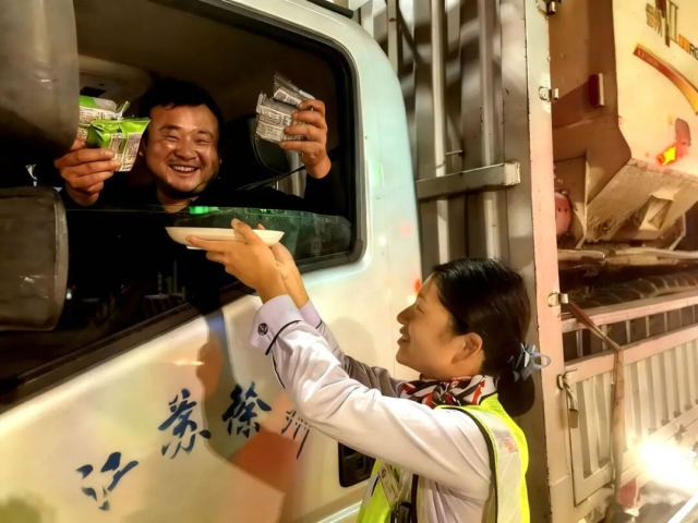 合肥中心龍?zhí)琳臼召M(fèi)員為司乘送上“小柿燈”