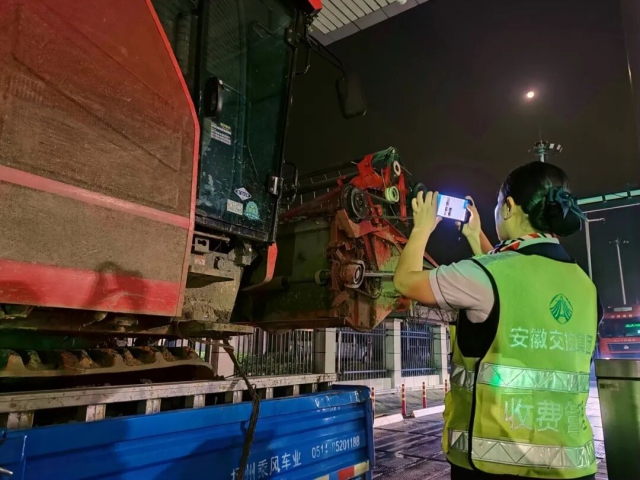合蕪中心柘皋站收費(fèi)員快速查驗(yàn)跨區(qū)作業(yè)收割機(jī)