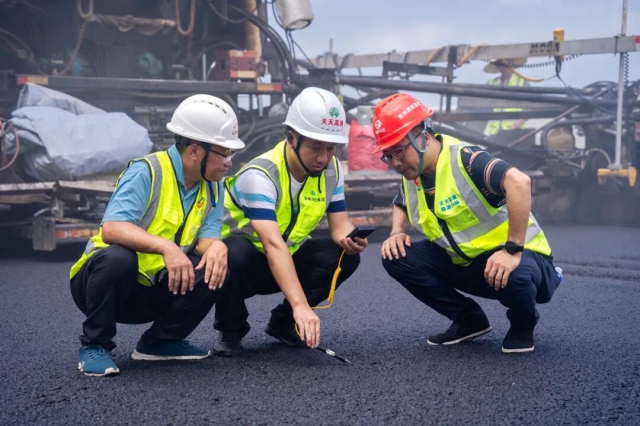 建設(shè)公司天天項(xiàng)目辦質(zhì)安部工作人員在施工現(xiàn)場(chǎng)檢查路面上面層施工質(zhì)量