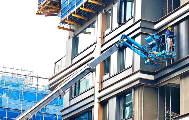 交控建工集團(tuán)濱科城項(xiàng)目工人進(jìn)行外幕墻鋁板安裝施工