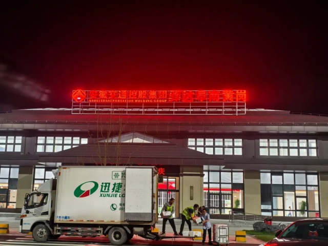 迅捷物流公司冷鏈倉(cāng)配一體化項(xiàng)目配送人員在服務(wù)區(qū)為客戶(hù)配送冷凍產(chǎn)品