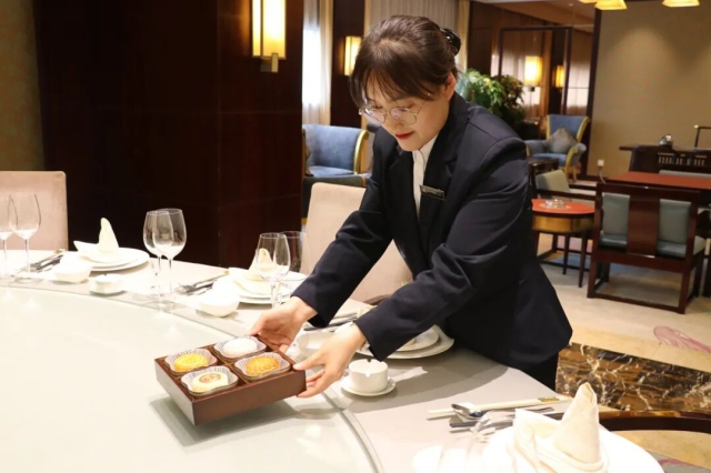 酒店公司高速開(kāi)元酒店餐飲部員工為客人備餐