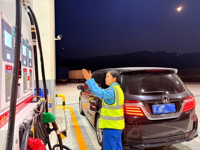 交控石油公司溫泉服務(wù)區(qū)加油站員工為顧客加油